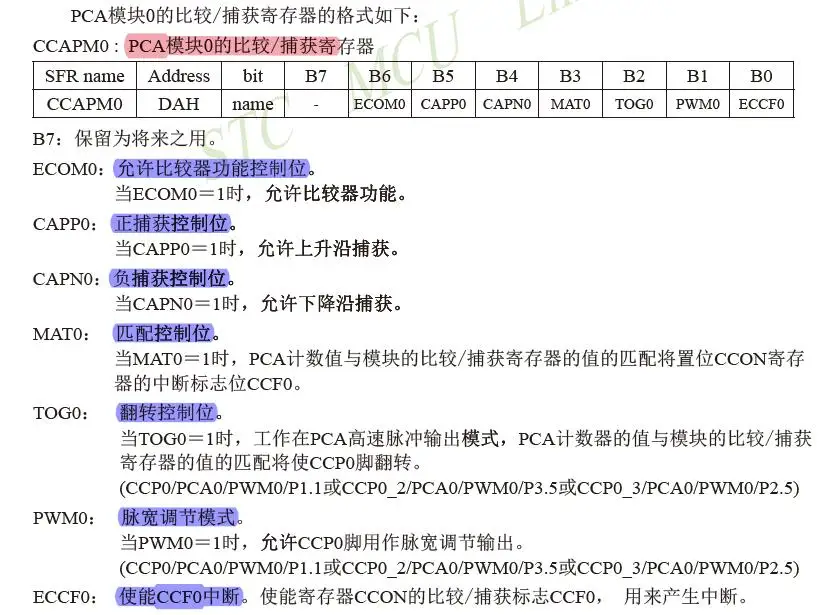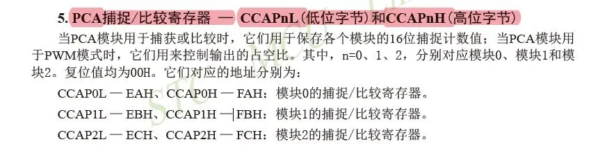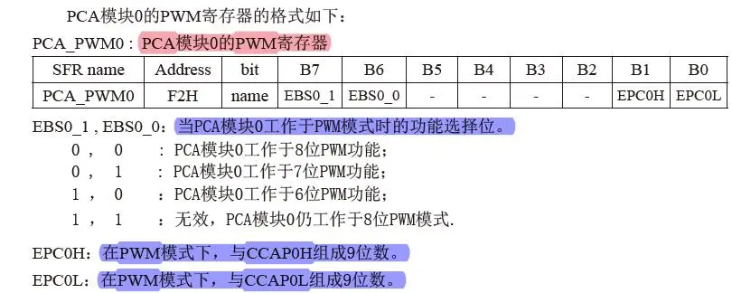 由于所有模块共用仅有的PCA定时器,所有它们的输出频率相同,各个模块的输出占空比是独立变化的,与使用的捕获寄存器{EPCnL,CCAPnL[7:0]}有关