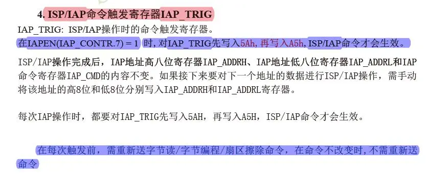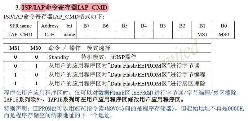 EEPROM可用于保存一些需要在应用过程中修改并且掉电不丢失的参数数据。在用户程序中,可以对EEPROM进行字节读/字节编程/扇区擦除操作。 在工作电压Vcc偏低时,建议不要进行EEPROM/IAP操作