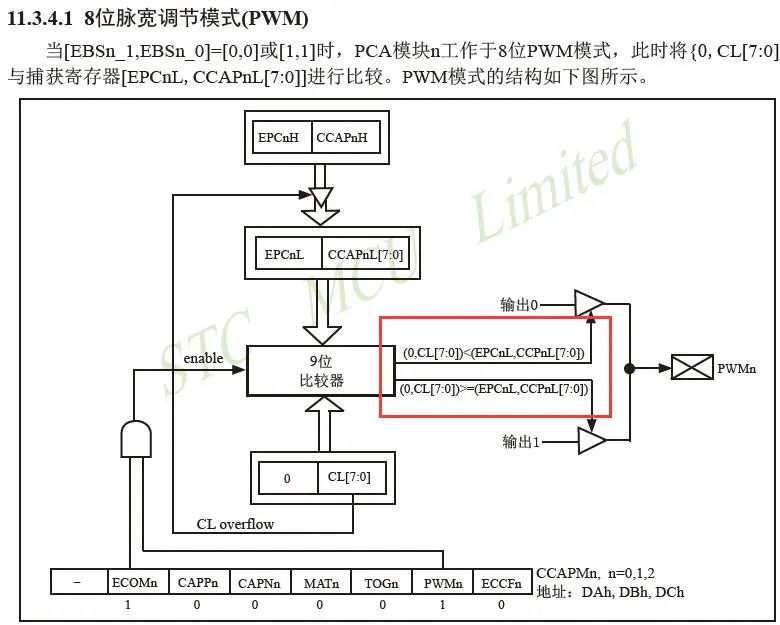 首先通过CCAPWM使能比较器和PWM输出,利用CMOD设置时钟源,再将CL中的数值与CCAPnL中的比较,大于等于输出高电平,小于输出低电平,当CL溢出后(0xFF->0x00),CCAPnH中的数据会载入CCAPnL中