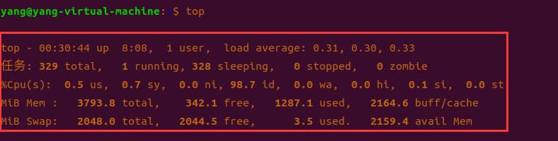系统现在共有329个进程,其中处于运行中的有1个,328个在休眠(sleep),stoped状态的有0个,zombie状态(僵尸)的有0个。 - 第三行,cpu状态信息