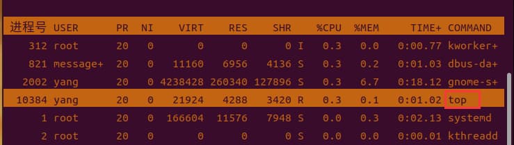 进程id为10384的“top”进程被加亮了,top进程就是视图第二行显示的唯一的运行态(runing)的那个进程,可以通过敲击“y”键关闭或打开运行态进程的加亮效果。 - 进程字段排序