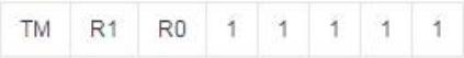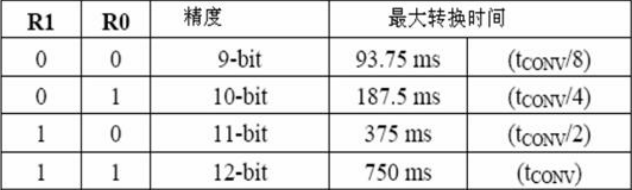 低五位一直都是"1",TM 是测试模式位,用于设置 DS18B20 在工作模式还是在测试模式。在 DS18B20 出厂时该位被设置为 0,用户不需要去改动。 R1 和 R0 用来设置 DS18B20 的精度(分辨率),可设置为 9,10,11 或 12 位,对应的分辨率温度是 0.5℃,0.25℃,0.125℃和 0.0625℃。R0 和 R1 配置如下: