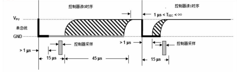 所有读时序 至少需要 60us,且在 2 次独立的读时序之间 至少需要 1us 的恢复时间。每个读时序都由主机发起,至少拉低总线 1us。主机在读时序期间必须释放总线, 并且在时序起始后的 15us 之内采样总线状态。