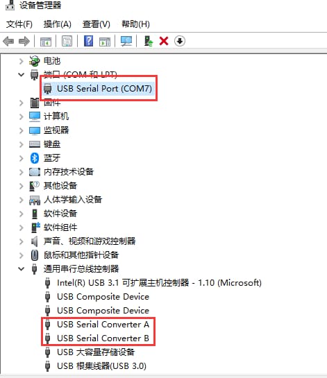 - 安装成功后会看到【端口】栏有一个“USB Serial Port(COMx)”(x是你当前端口号),然后在下面【通用串行总线控制器】有“USB Serial Converter A”和“USB Serial Converter B”(注意:不要把线插到