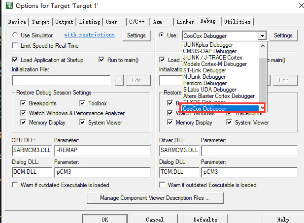 魔法棒–debug– 选择《Use Simulator》,打勾《Run to main()》;--Target– 晶振那写“8.0” - 在你需要测试的PWM函数前设断点,再点击右上角那个