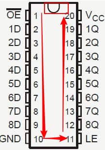 - 74HC573芯片缺口方向 为正,然后左上往下排列,最后一个是GND,然后 向右,再向右上,右上角为Vcc(GND 和Vcc成对角线,是为了防止发生短路)