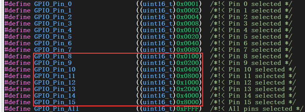 - 我们想配置 Pin8~Pin15,我们可以直接0x0100+0x0200+0x0400+0x0800+0x1000+0x2000+0x4000+0x8000=0xFF00