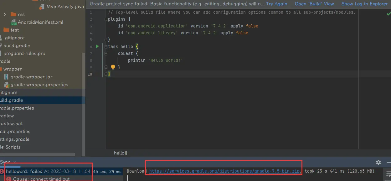 • 进去后需要去下载Gradle,不要在AS里下会超时的,直接跳转到这个下载地址下载【如果您没有下载Gradle,那么您将无法执行Gradle任务。Gradle是一个构建自动化工具,用于构建、测试和部署软件】