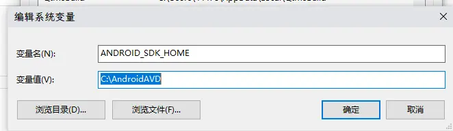 首先在C盘(也可以在其他盘中文也不要紧)创建一个文件夹–AndroidAVD,然后打开环境变量,在系统变量那新建一个变量名固定,变量值填你创建的那个文件夹(记得把之前填的SDK啥的变量删了)