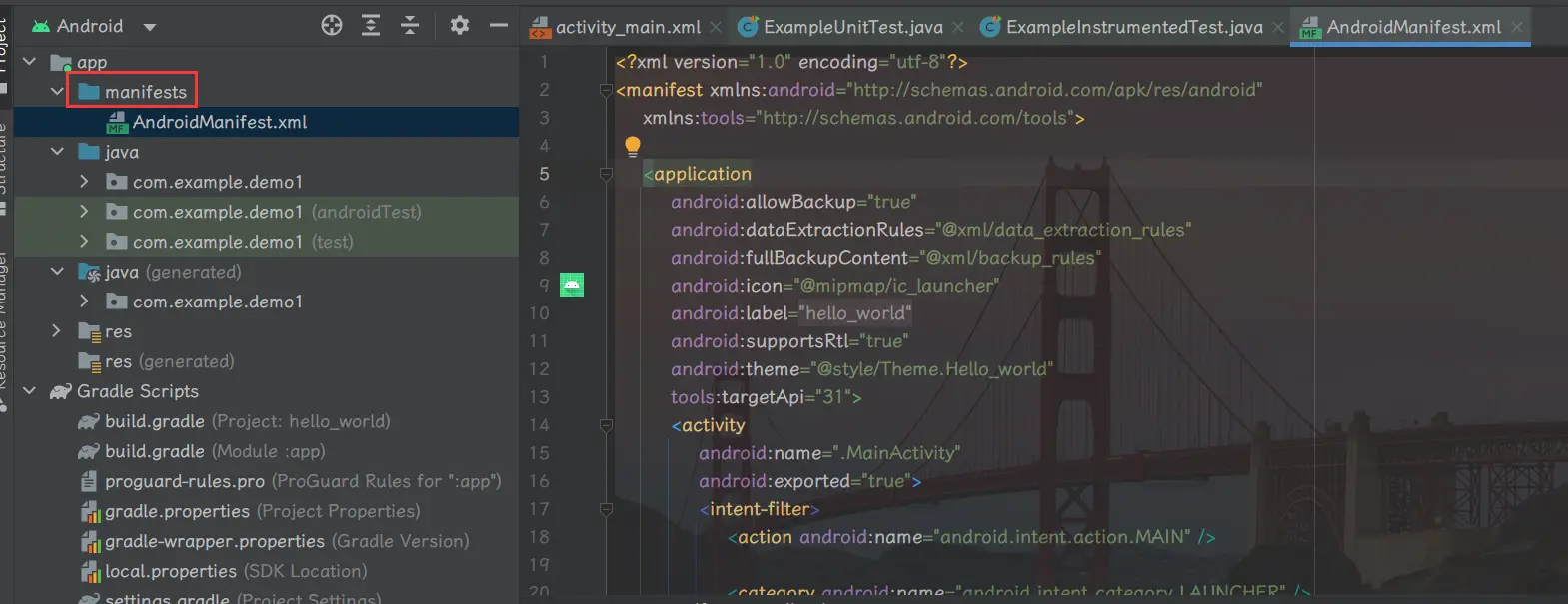 manifests目录下面,只有一个【AndroidManifest.xml】文件,这个文件是Android应用的启动配置文件,用于设定Android应用启动时候的一些参数信息,例如: 启动图标、应用名称、主题、页面布局等等