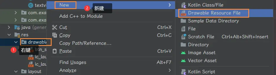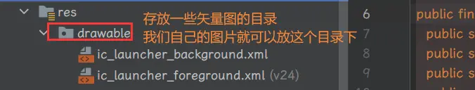 注意:上面图片中,【drawable】目录下面有两个xml文件,其中一个后面标记了 (v24),这个【v24】是Android 7.0版本以上的, 主要是为了让矢量图兼容Android 7.0版本以上的应用程序