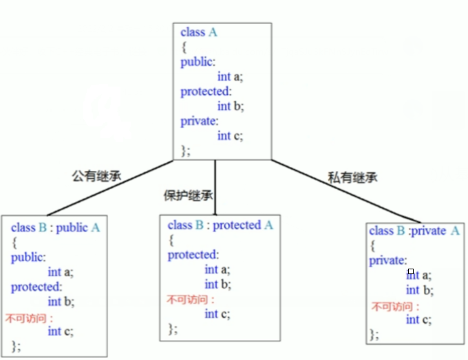 父类所有非静态成员属性都会被子类继承下去,父类中私有成员属性是被编译器隐藏了因此访问不到,但是确实被继承下去了