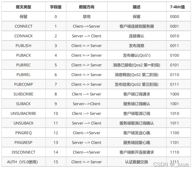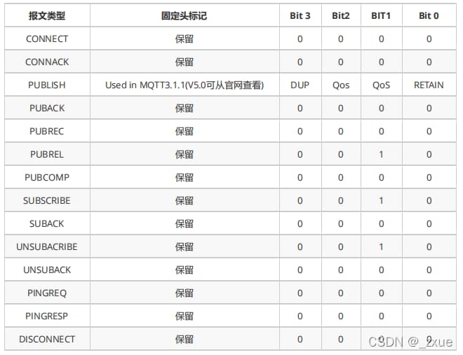 注:目前bits[3~0]只在PUBLISH协议中使用有效,并且表中指明了是 MQTT 3.1.1版本。对于其它MQTT协议版本,内容可能不同。所有固定头标记为"保留"的协议类型,bits[3~0]必须保持与表中保持一致,如SUBSCRIBE协议,其bits[1]必须为 1 。如果接收方接收到非法的消息,会强行关闭当前连接。
