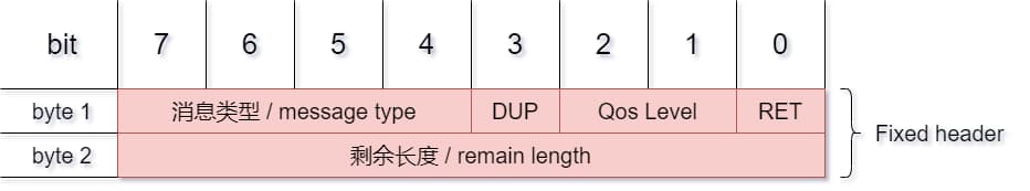 bit[2],bit[1]为QoS字段,如果bits[1]和bits[2]都为0,表示Qos 0(至多一次);如果bit[1]为1,表示Qos 1(至少一次);如果bits[2]为1,表示Qos 2(只有一次);如果同时将bits[1] 和 bits[2] 设置为1,那么客户端或服务器认为这是一条非法的消息,会关闭当前连接