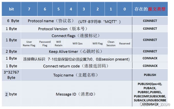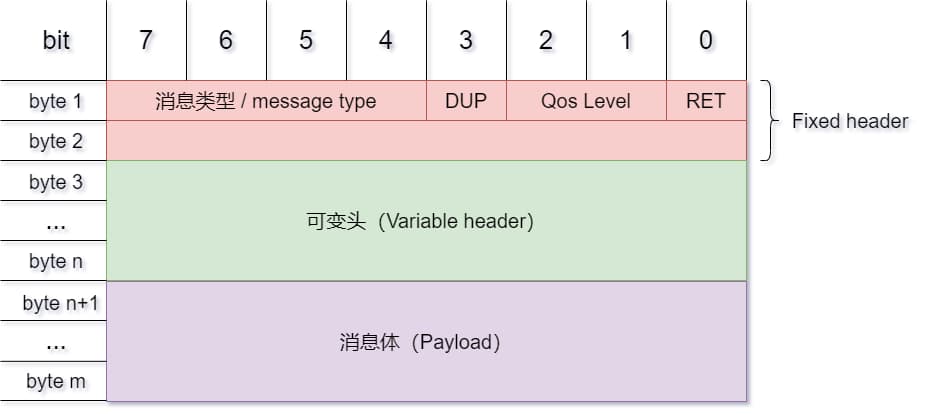 固定头(Fixed header):存在于所有MQTT数据包中,表示数据包类型及数据包的分组类标识可变头(Variable header):存在于部分MQTT数据包中,数据包类型决定了可变头是否存在及其具体内容消息体(payload):存在于部分MQTT数据包中,表示客户端收到的具体内容