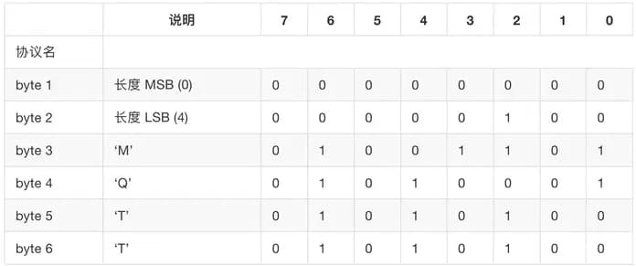 协议名:表示协议名 “MQTT” 的UTF-8编码的字符串。MQTT规范的后续版本不会改变这个字符串的偏移和长度
