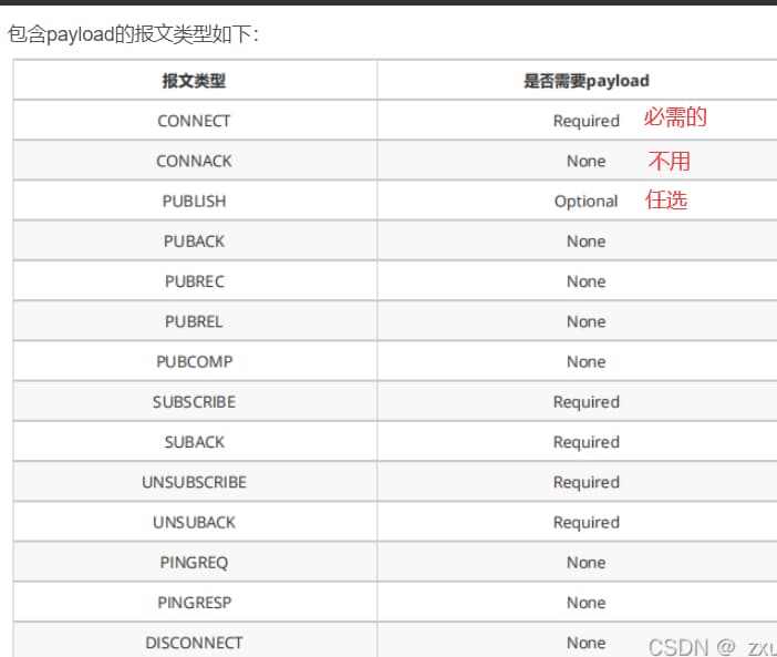 有些报文类型是包含 Payload 的,Payload意思是消息载体的意思,如 PUBLISH 的Payload就是指消息内容(应用程序发布的消息内容)。而CONNECT的Payload则包含 ClientIdentifier,Will Topic,Will Message,Username,Password 等信息。
