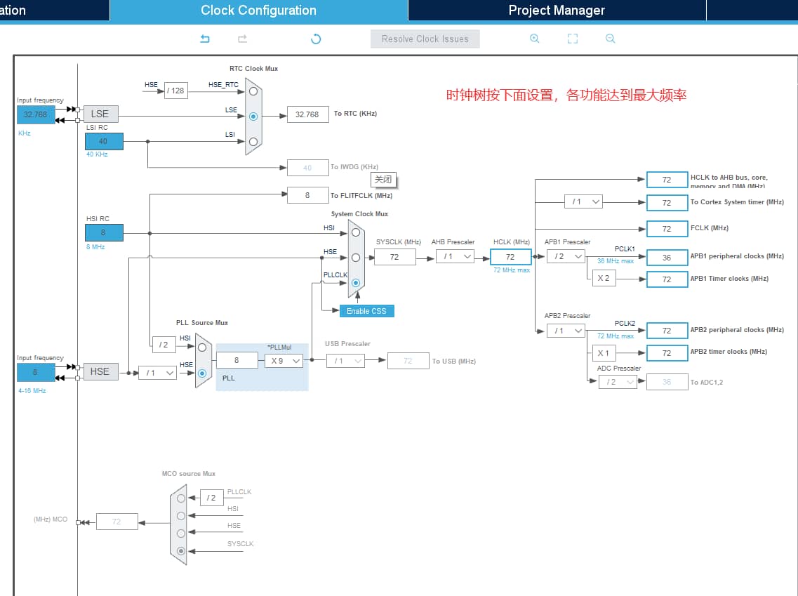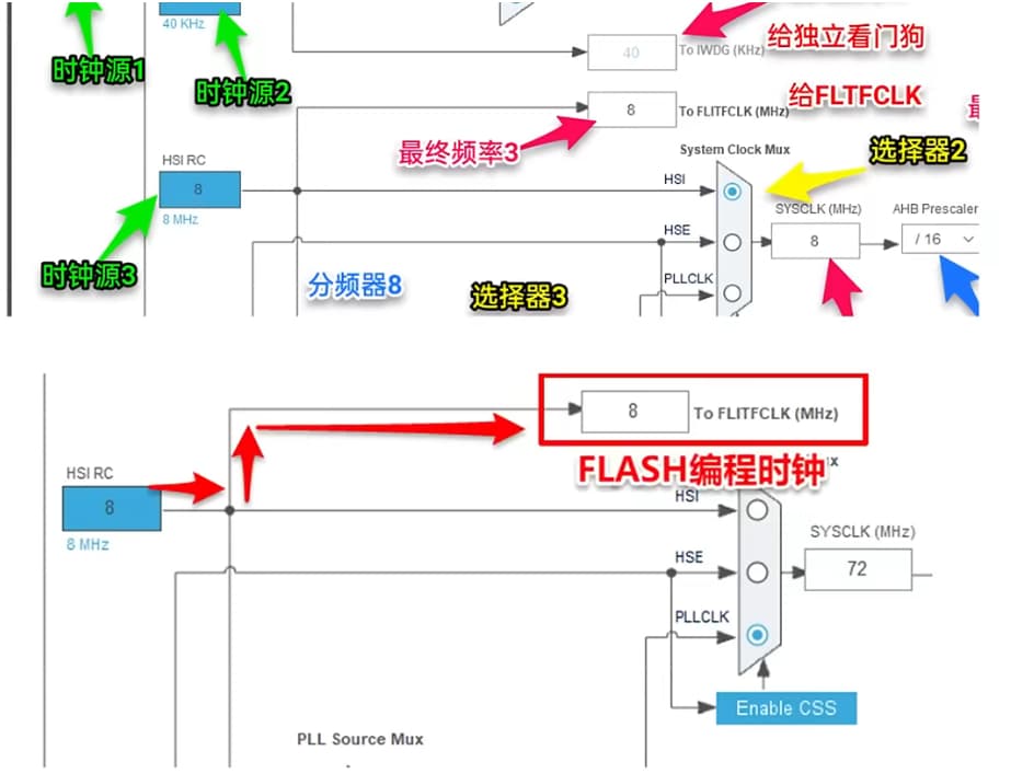 • FLASH 编程时钟,作用是使用串口或JTAG接口给单片机下载程序时,为FLASH编程操作提供时钟,在单片机下载过程中单片机处于 BOOTLOADER 模式,系统时钟没有启动,所以 HSI 内部高速时钟直接给 FLASH编程提供独立的时钟输入,FLASH编程时钟频率固定是8MHz,不允许修改