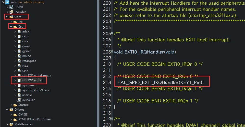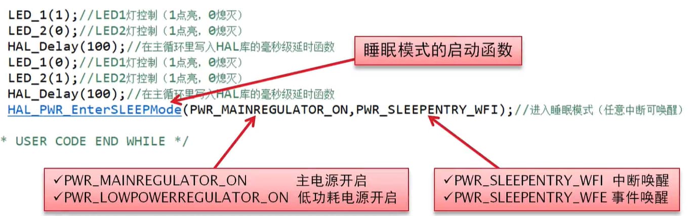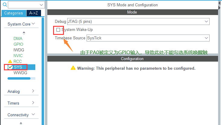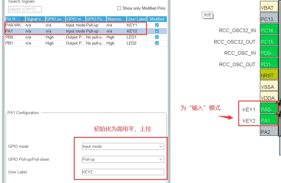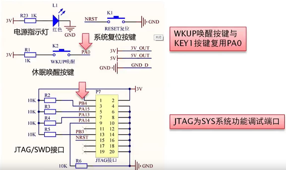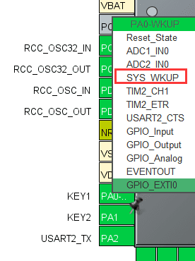 ​ 由于唤醒键与核心板上的 KEY1 按键复用PA0端口当多个功能复用一个端口时,要按单片机启动后最先用到的功能来设置,如果中途需要改为其他功能,可以在程序里以新功能再初始化设置一次;PA0 端口最先使用的是 KEY1 按键功能,KEY1 已经在核心板部分设置过了,所以唤醒键不需要设置