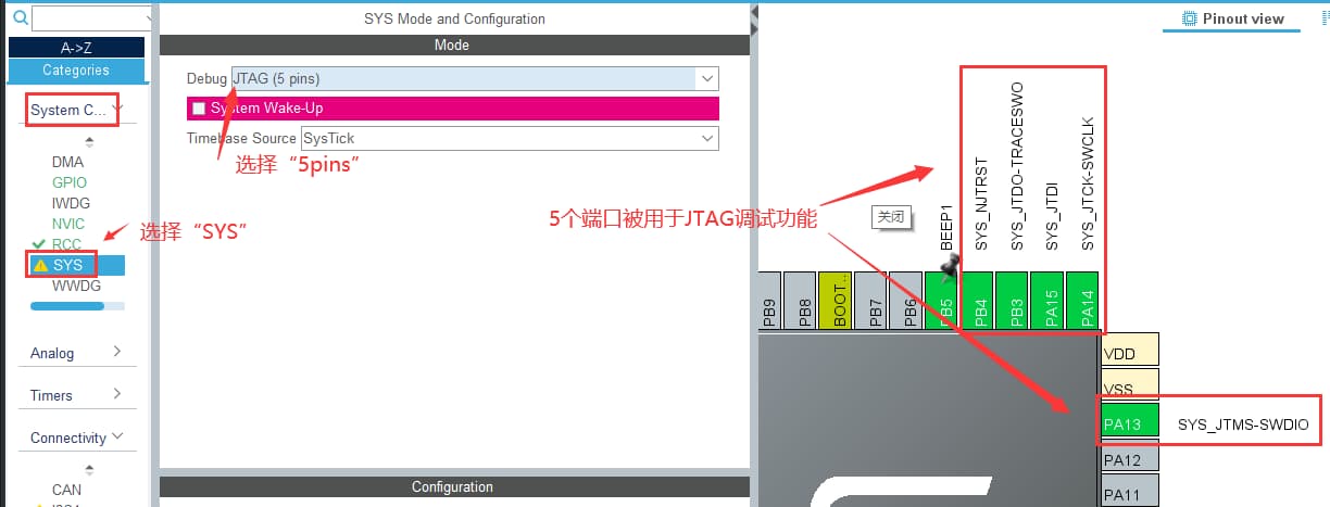 JTAG 端口并不普通,它是 ARM 核心的标配功能,所有 ARM 内核的单片机都有 JTAG 接口,由于它的特殊性,它的设置需要在功能分组中展开系统内核JTAG 没有参数设置只需开启即可