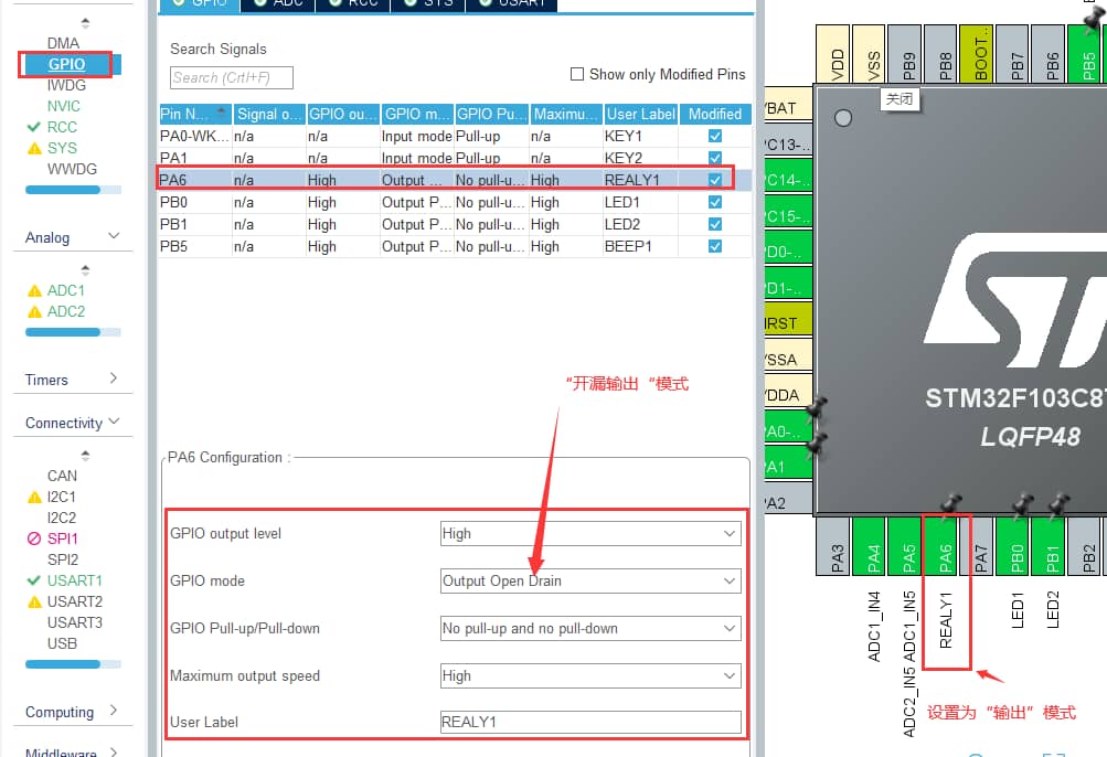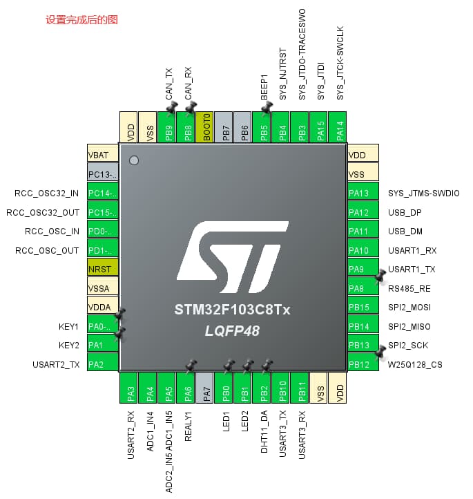 设置完成后,空闲引脚有PA7、PB6、PB7PB6和PB7可做 I2C 接口,PA7可做ADC接口虽然PC13空闲但其性能有限,需谨慎使用