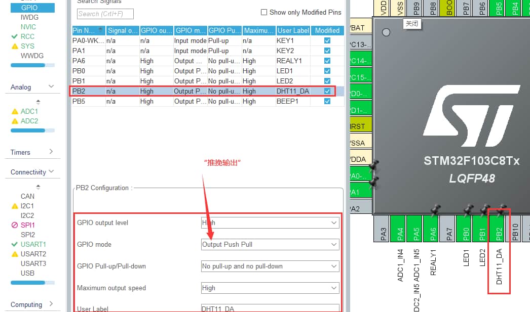 因为温湿度传感器是单总线,需要用GPIO模拟通信协议时同一个端口有两种状态输入又输出,所以先设置为输出模式,等程序中需要输入时,再用程序代码切换到输入模式