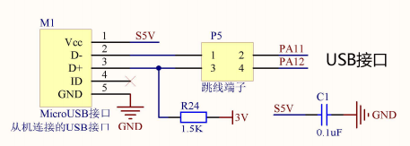 USB 接口是单片机内部的 USB 从设备功能,可以让单片机通过 USB 连接到电脑,实现 USB键盘,USB串口,U盘等功能