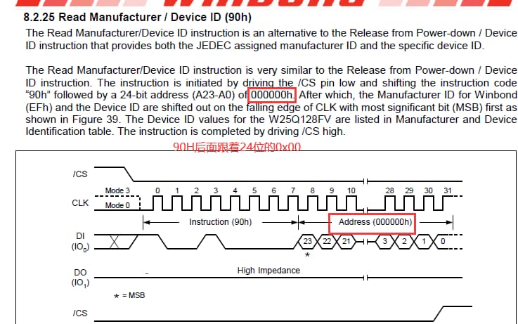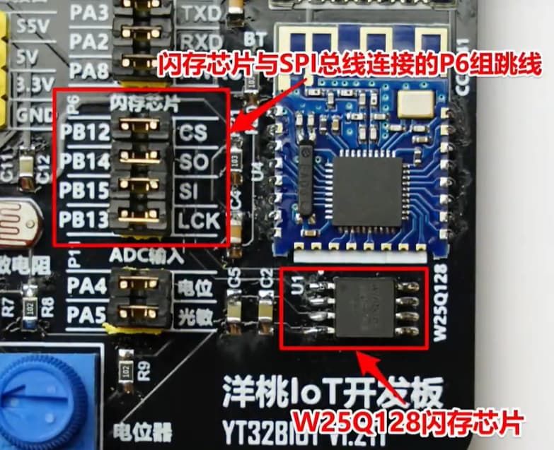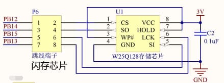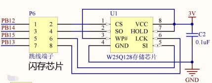 闪存芯片是指开发板上的 W25Q128 存储芯片,它通过 SPI总线与单片机通信,另外,连接到 SPI总线上的每个设备都必须独立再连接一个使能控制端口CSCS连接在 PB12 端口,PB12输出低电平,闪存芯片将被激活