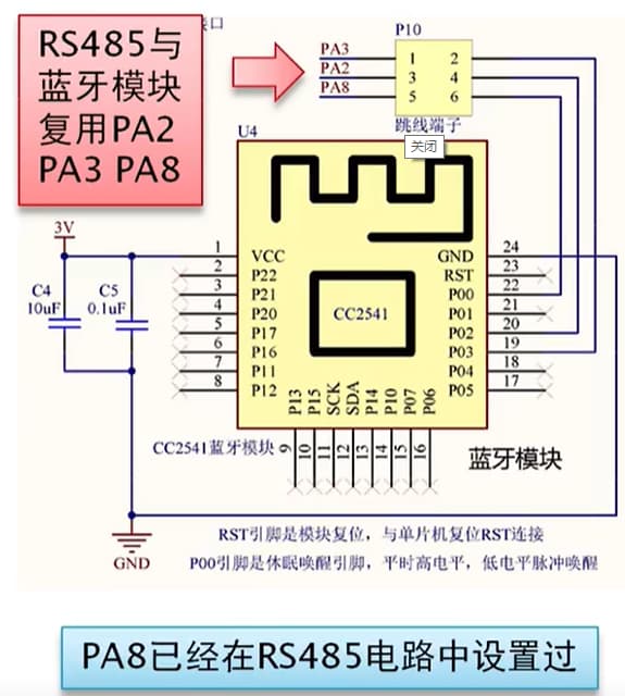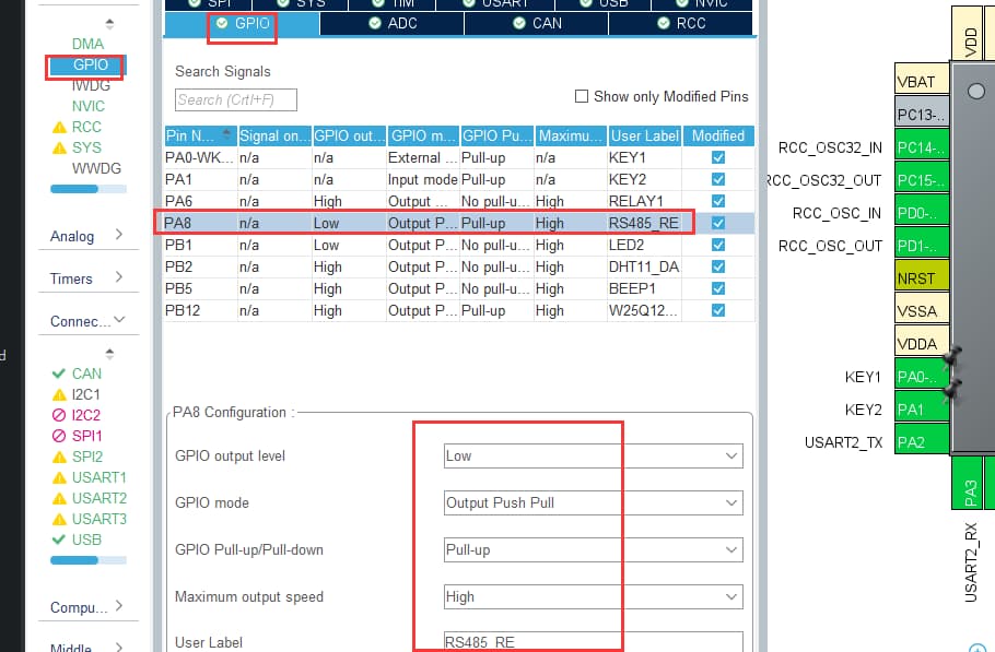 RS485 的通信直接使用单片机内部的 USART2 串口功能,但 RS485总线还需要一个收发选择端口 RE,还要占用一个 GPIO 作为 RE 使用,当 RE 为高电平时 RS485 处于发送状态,为低电平时为接收状态