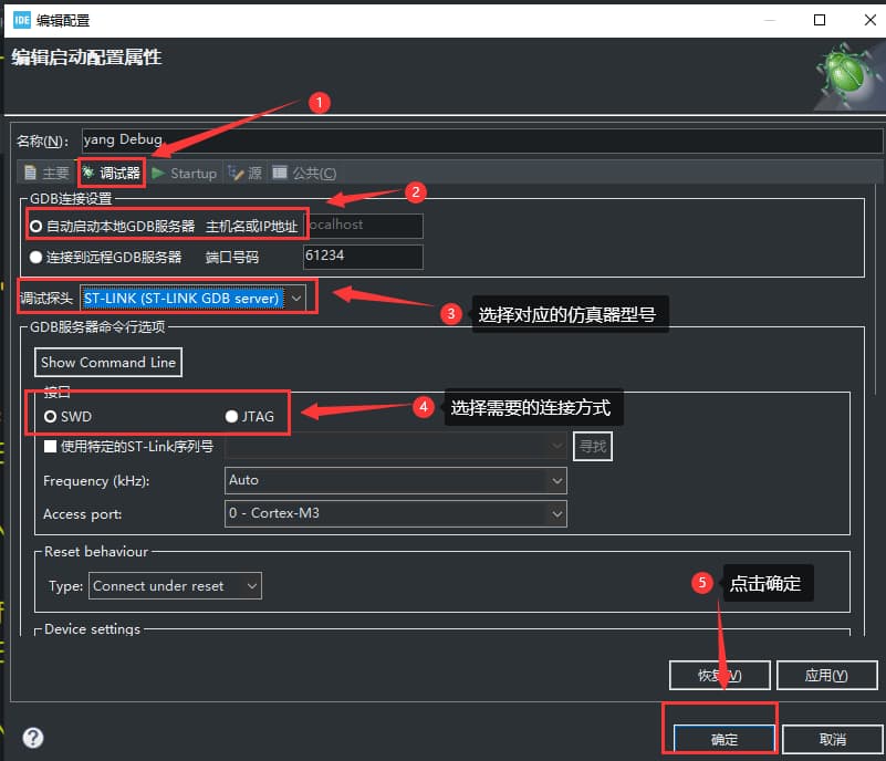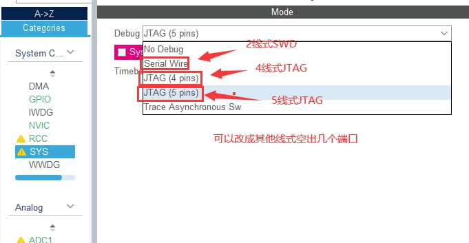 仿真接口设置为JTAG模式时占用5个引脚设置为SWD模式时占用2个接口