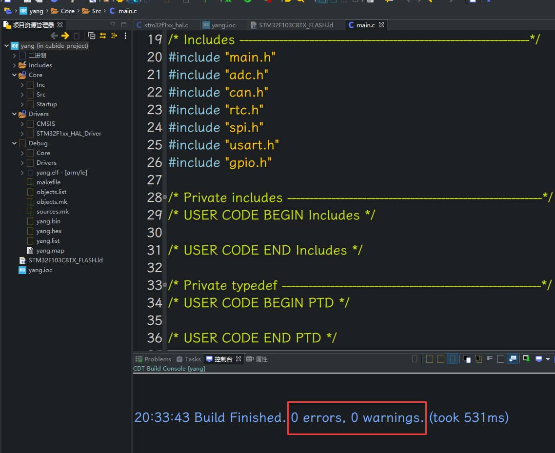 如果出现有错误则检查一下是不是文件路径有中文,记住之前安装时用到的路径都不能有中文!!!(或者再编译一次我第一次编译也有错误再编译一次就没了);如果没有错误则会在左边资源管理器中的 Debug 文件会生成 hex 文件