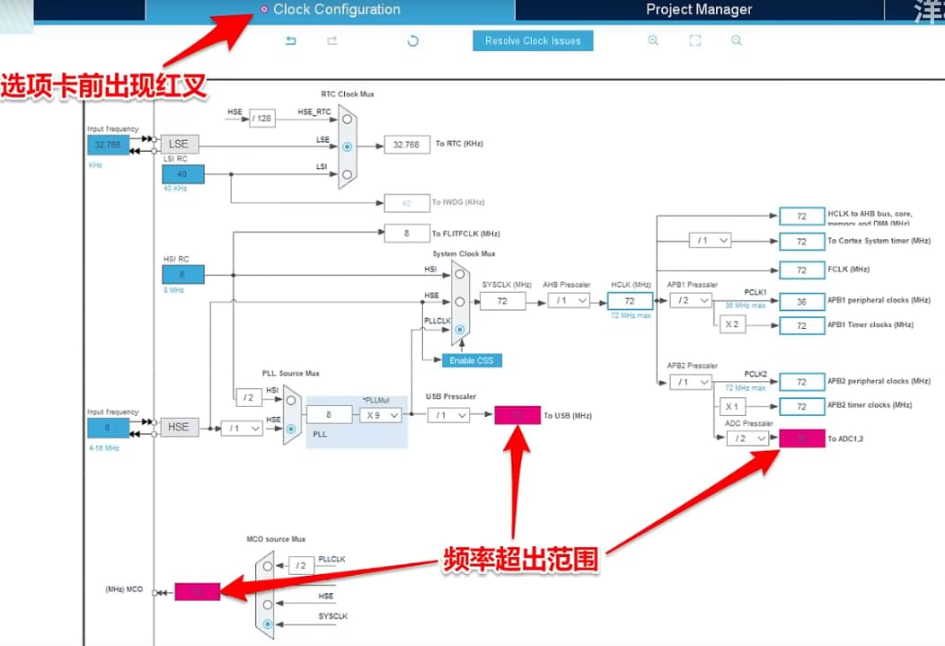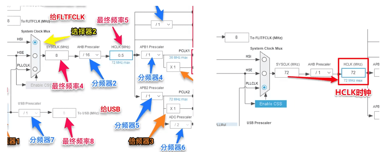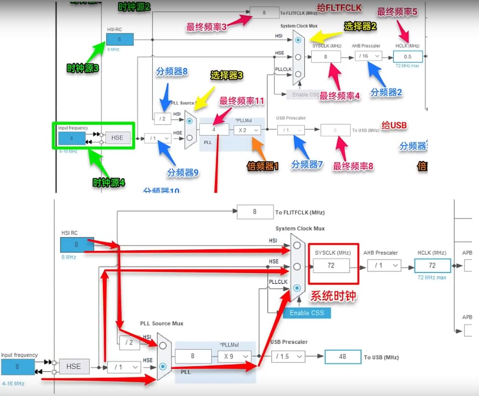 • (以下描述以下面图片标号代替)最终频率4系统时钟,其它时钟都是基于系统时钟的,它表示着单片机最大频率,频率越大速度越快,系统时钟作为源头,分配给各内部总线和功能,通过选择器2可以选择 3 个输入源,分别是第一个是 HSI 内部高速时钟输入(没有经过分频器和倍频器),直接给系统时钟 8MHz 频率,由于 HSI 采用的是 RC 振荡器,导致频率精度不高,不能用于对时间精度要求很好的项目中;第二个是 HSE 直接输入(需要单片机外接4~16MHz晶振,虽然外接晶振增加成本,但是时间精度大大提高),适用于时间精度要求好的场合,选择此项后的系统时钟频率就是 HSE 晶振的频率,所以 HSE 是8HMz系统时钟就是8HMz第三个是 PLLCLK 输入(是经过分配器,倍频器和选择器分配后的频率,加入了 PLL 锁相环电路,可以在一定范围内调整频率值),前两个选项虽然简单直接,但得到的频率是固定值没法超频或者降频 通过选择器3可以切换 HSI 和 HSE 输入源,选择器后端进入 PLL 锁相环电路,通过倍频器1升高频率,最终可分配给 SYSCLK 系统时钟和 USB 时钟STM32F103单片机系统时钟最大值是72HMz