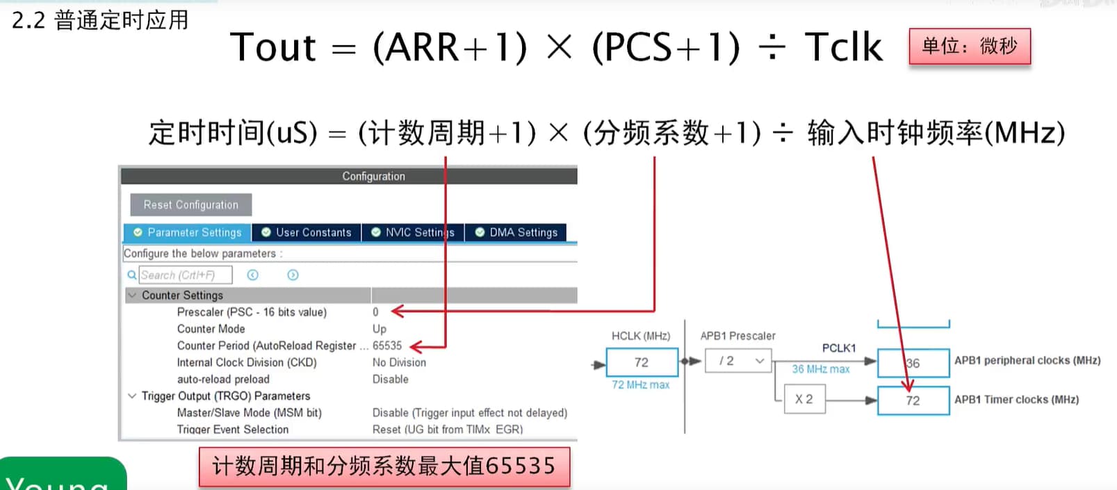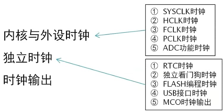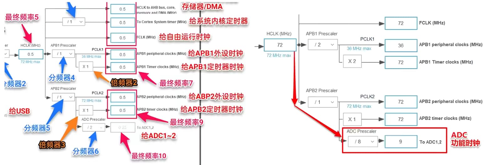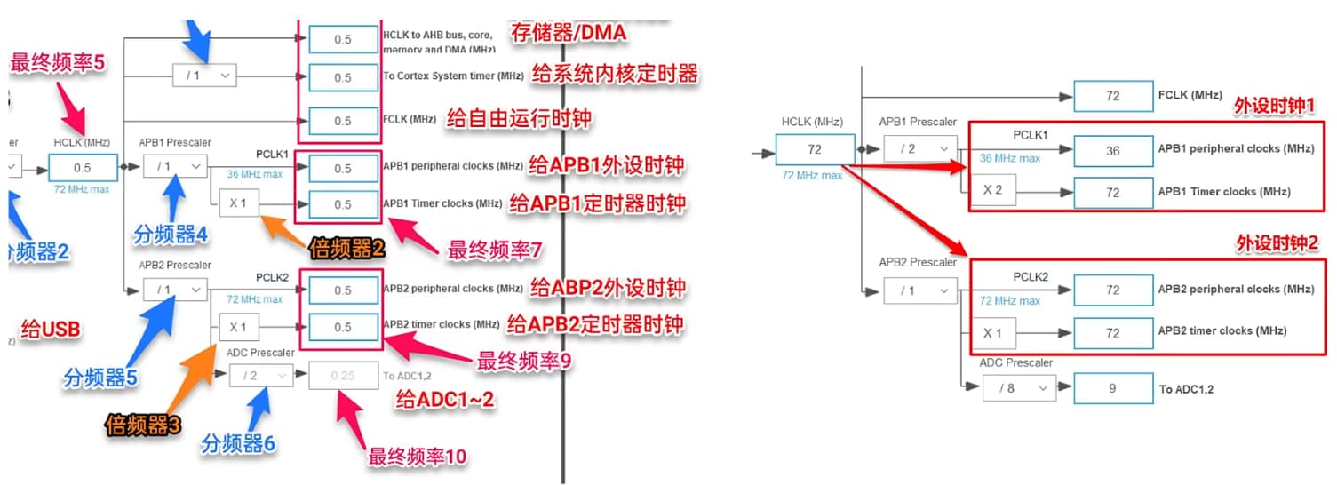 • PCLK 外设时钟,它作用是给单片机的外设功能提供时钟(这里说的外设并不是单片机外面的设备,而是相对于 ARM 内核以外的单片机内部功能),PCLK 时钟分配给 APB1总线和 APB2总线两个部分,每个总线上都挂着不同的单片机内部功能,最终频率7就是 APB1相关的时钟(包括 APB1外设时钟和APB1定时器时钟),可以通过分频器4倍频器2来设置频率(注意:APB1外设时钟最大频率是36HMz,APB1定时器时钟最大频率是72HMz),最终频率9就是 APB2相关的时钟(包括 APB2外设时钟和APB2定时器时钟,它们最大频率都是72HMz),可以通过分频器5倍频器3来设置频率