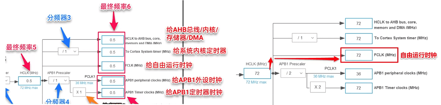 • FCLK 时钟自由运行时钟,作用是专为 ARM 内核提供运行的时钟频率,刚刚讲的 HCLK 时钟也为内核提供时钟频率,它们区别是HCLK 是从 AHB 总线的电路上提供时钟,而 FCLK 不受总线的限制,即使 AHB 总线停止工作,FCLK 时钟也能直接向 ARM 内核提供时钟,由于内核时钟与 AHB 总线时钟必须频率相同才能正常工作,所以在时钟树里这两个值始终相同