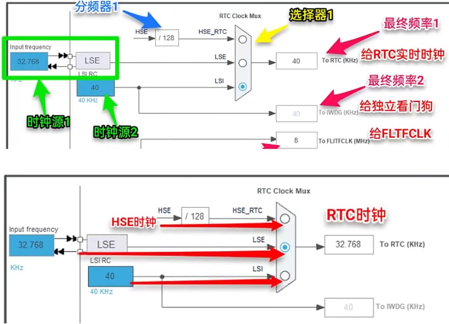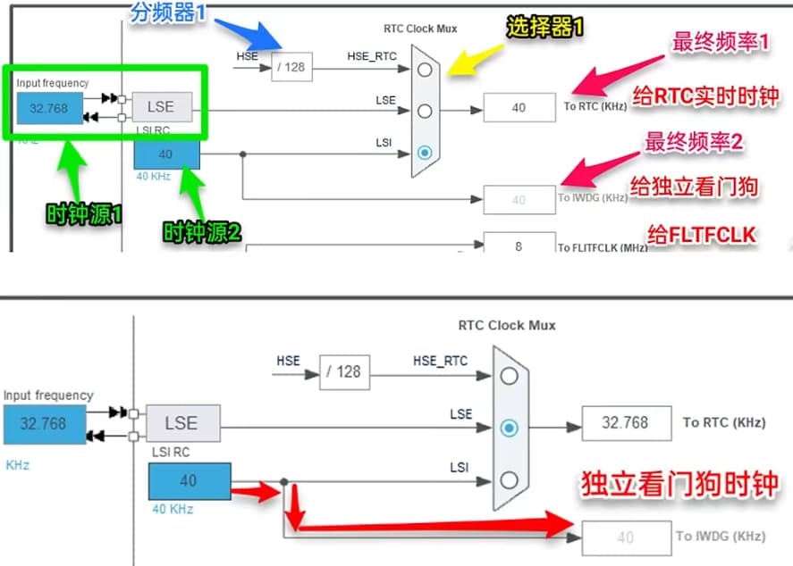 • RTC时钟在时钟树视图左上角,可通过选择器1切换3个输入源第一个输入源是 HSE 外部高速时钟,经过了分频器1128分频,当 HSE 晶振是8HMz时,经过128分频得到约62.5KHz的频率进入RTC时钟;第二个输入源是 LSE 外部32.768KHz的低速时钟未经过分频和倍频,直接输入到RTC时钟,得到32.768KHz频率;第三个输入源是 LSI 内部40KHz的低速时钟,也未经过分频和倍频,得到40KHz频率;三种输入源让 RTC 时钟得到不同的频率值 RTC功能配上备用电池可以为系统提供掉电依然走时的功能,这功能可用于实时时钟的走时,还可以把 RTC 时钟当成一个长时间定时器使用,走时一般要求精度很高,这时必须在 LSE上外接精度很高,温度漂移很小的32.768KHz晶振,选择器1就必须选择 LSE 输入源,但如果把 RTC当长时间定时器使用,则对精度要求低,误差几分钟都无所谓,则不用外接晶振,使用精度不高的 LSI 或者 HSI 也能达到要求,如果对系统时钟的频率精度要求也不高,连HSE外部8MHz也可以省去