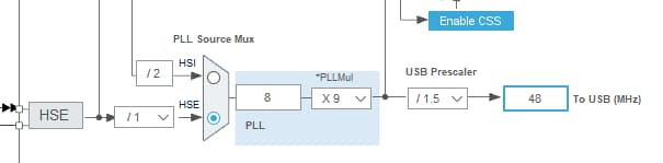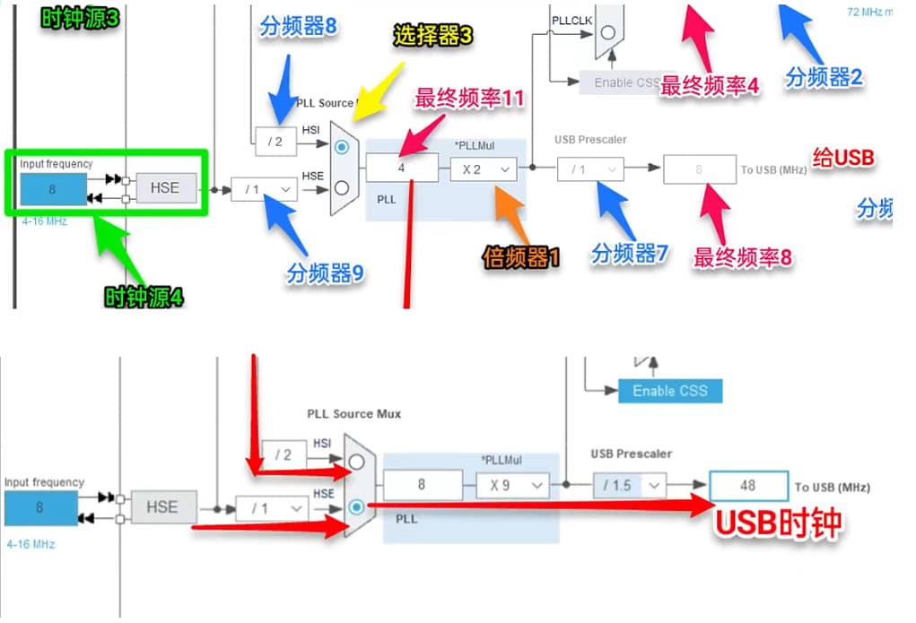 • USB接口时钟,USB功能是指单片机内置的USB从设备接口,此功能在单片机内部是独立工作的,USB时钟频率允许我们修改,通过选择器3切换 HSI 和 HSE 两个输入源,可通过分频器7,分频器8,分频器9,倍频器1来调配频率值(注意:只有分频器7是USB时钟专属的,其他都与系统时钟设置共享,设置时需要考虑到系统时钟的联动变化),USB时钟的最大频率是48MHz