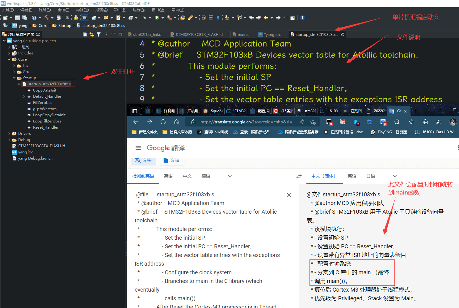 单片机在最开始运行时并不是从main函数开始而是先运行汇编启动文件,启动文件里对单片机的 RAM,FLASH,时钟,电源,中断等基础功能进行初始化设置,这些是保证单片机正常工作的必要条件,由于汇编文件非常重要,不允许修改,下面图中设置向量表作用是在单片机运行中发生异常时会自动跳转到对应的异常处理函数中执行
