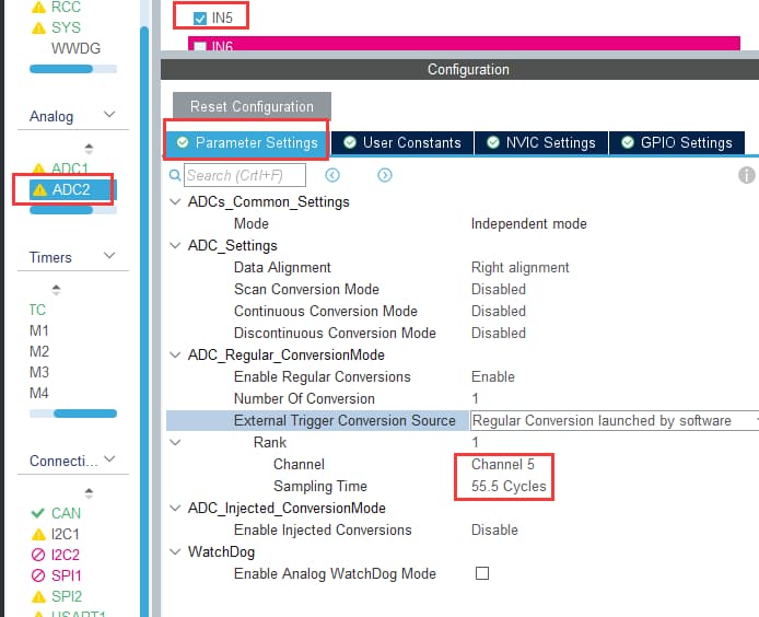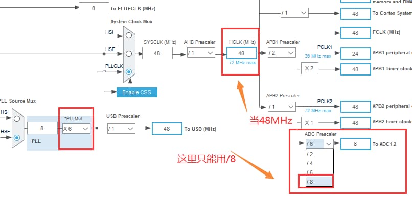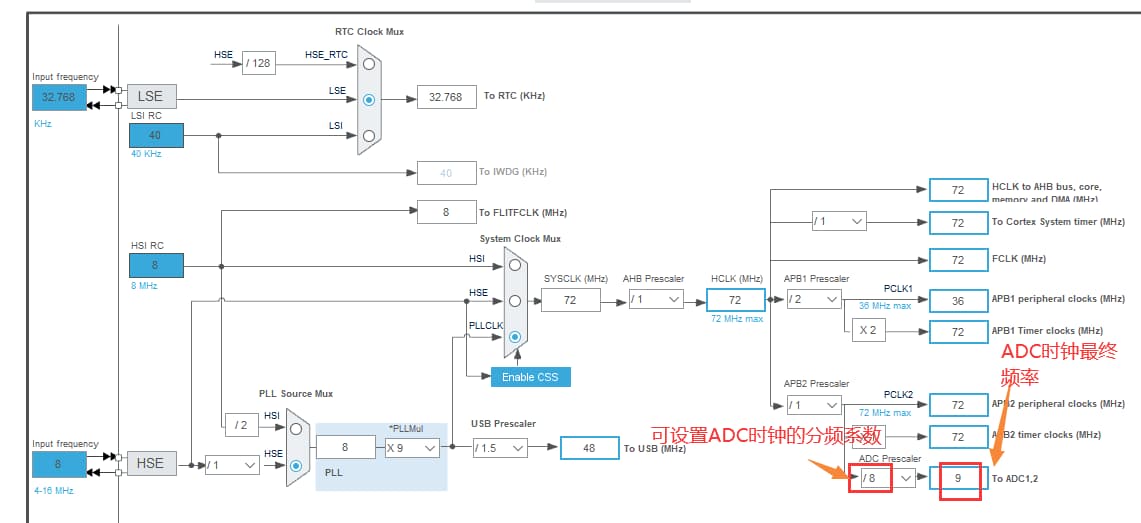 • ADC功能时钟,ADC功能涉及到模数转换器,标注为最终频率10,它的时钟挂接在 APB2总线上,同时提供给 <font color='ADC1 和 ADC2 两个功能</>ADC1 和 ADC2 两个功能,通过分频器6可以设置频率,最大值为14MHz