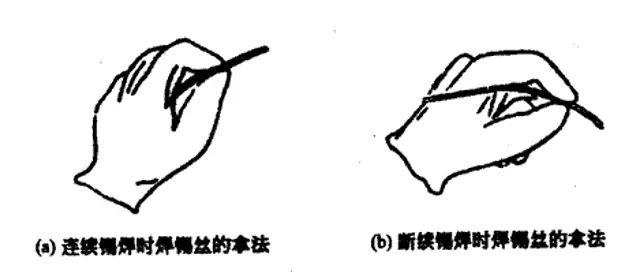 焊锡丝一般有两种拿法,如图二所示。由于焊丝成分中, 铅 占一定比例,众所周知铅是对人体有害的重金属,因此操作时应戴手套或操作后洗手,避免食入。