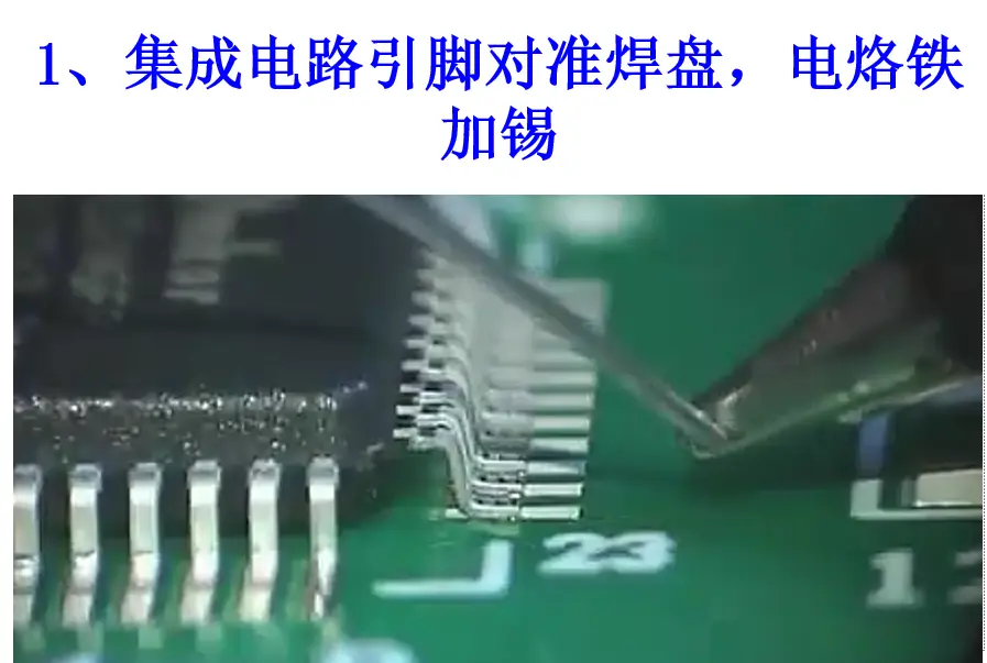 末端直到看见焊锡流入引脚,重复所有引脚必要时向烙铁尖加上少量的焊锡(在焊接时要保持烙铁尖与被焊引脚并行防止因焊锡过量发生搭接) -