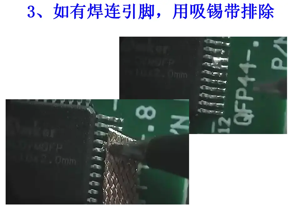 把吸锡带用电烙铁压在PCB的焊盘上,融化的焊锡会被吸走