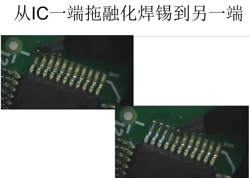 - 然后用烙铁头在锡上来回拖动(烙铁不要碰到焊盘,碰到锡就行),然后两边一直这样来回滚动,IC就会脱落