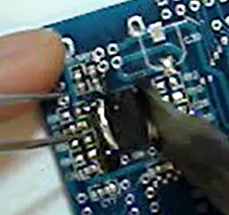 - 然后拿烙铁沾点松香,把拆下来的IC也修一下(此时左手的镊子应该是夹着刚刚拆下来的IC),把锡吸走