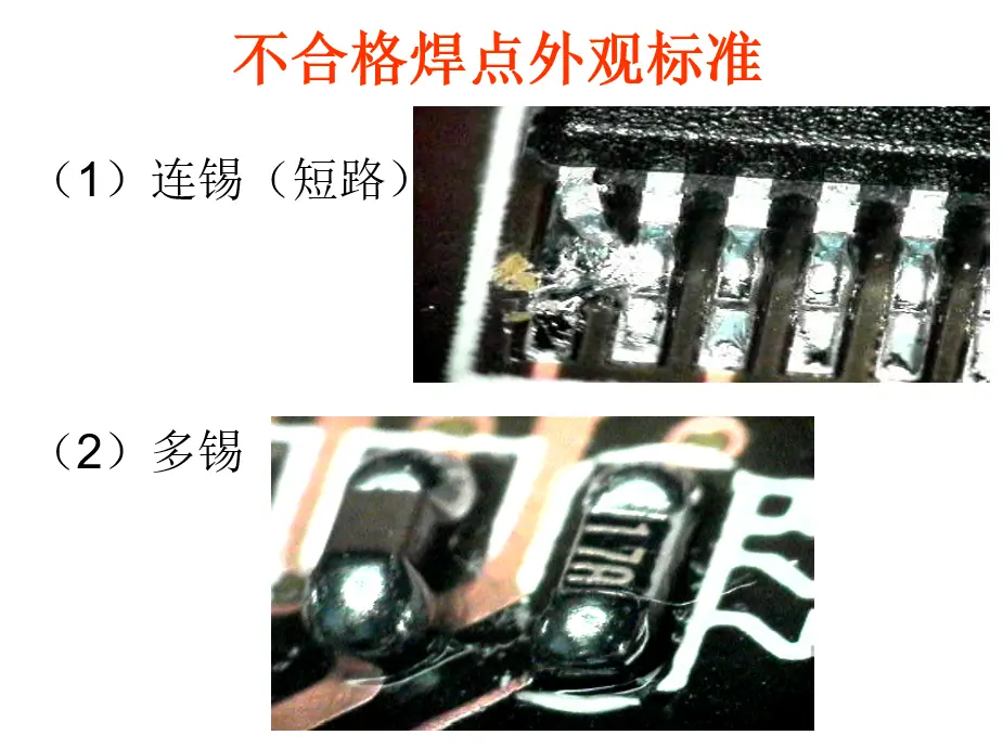 4倍放大镜或更高倍数检查短路或边缘焊锡搭接焊锡搭接应在每个器件引脚与PCB之间有一个平滑的熔化过渡,如有必要重焊这些引脚 -