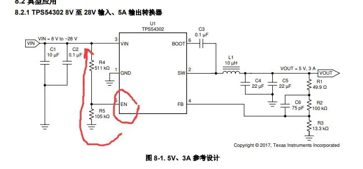 焊接电源后发现输入12V正常测到,输出5V测不到,相当于输出部分电压全部0V,经过看数据手册知道EN引脚需要接高电平,不能悬空,但是没有飞线铜丝所以把杜邦线拆了拿条铜丝进行飞线,把EN飞到VIN那,然后再测量输出5V左右正常了,这个教训告诉我要看数据手册的参考电路,不能只看引脚说明!!!(原理图已修改接到VIN然后顺便修改了IC的5V线宽20~25mil),不能直接飞会烧IC(刚刚直接燃起来了…),需要按照手册串联电阻