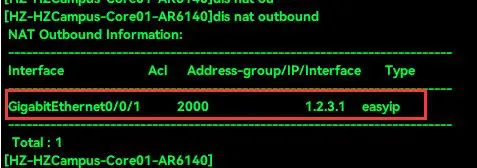 [RTA]int g 0/0/1 # 只有出口路由器上处接口一个公有ip 将编号2000的ACL运用在g0/0/1端口,绑定1号地址池