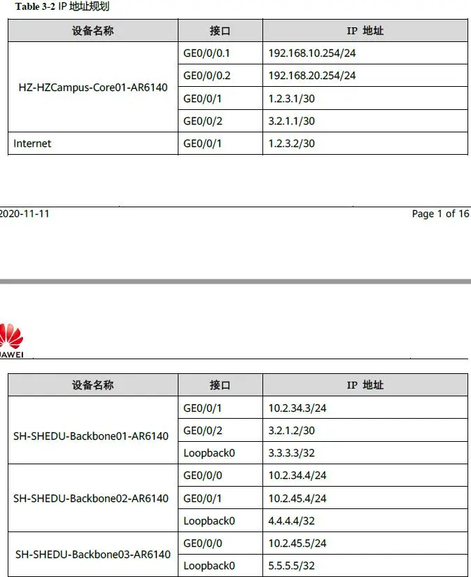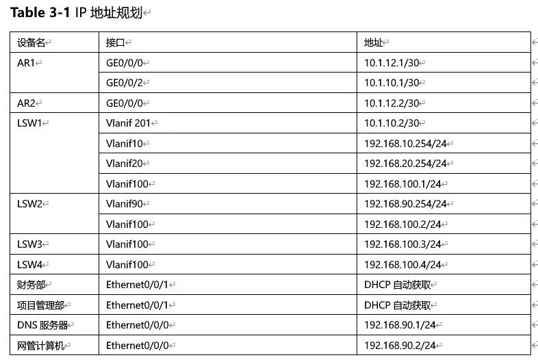 请根据 Figure 3-1 实验考试拓扑和 Table 3-2 IP 地址规划给出的信息,配置对应网络设备接口的 IP 地址。