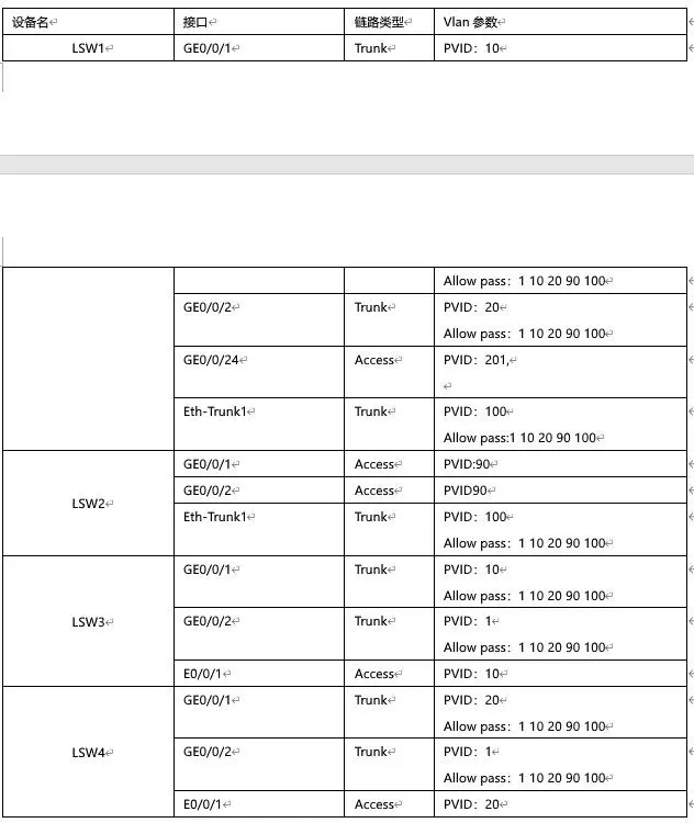 - 注意:为了保证网络的连通性,交换机只允许题目中规定的 VLAN 通过