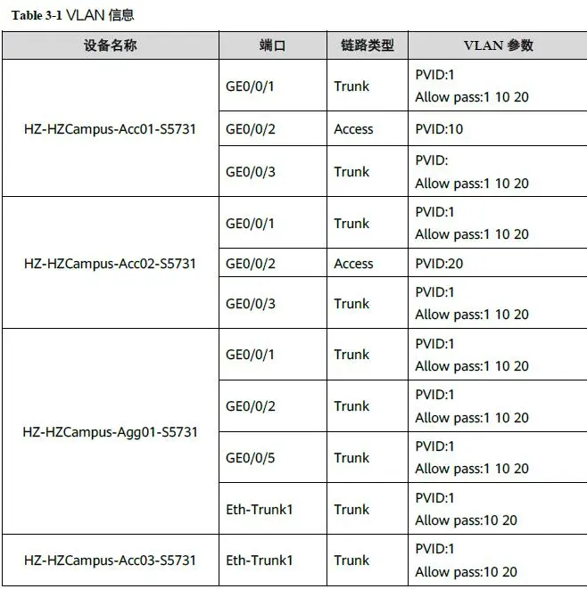 [HZ-HZCampus-Acc03-S5731-Eth-Trunk1]trunkport g 0/0/3 to 0/0/4任务3–VLAN