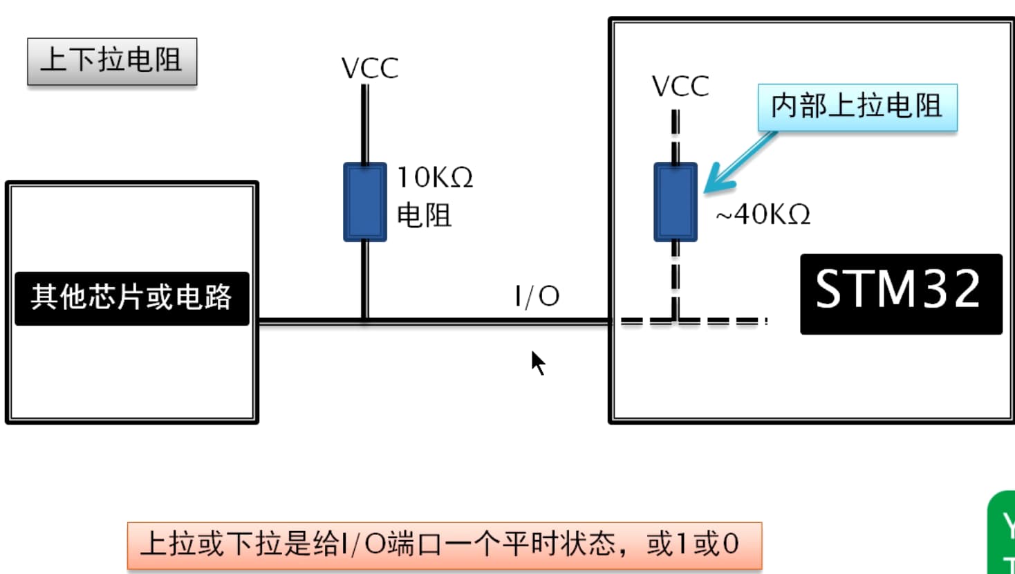 意思就是如果一个 I/O 口既不是1又不是0的状态如果不给上拉或者下拉电阻那么 MCU就不会判断到底是什么状态,所以通常会给一个上拉或者下拉;当给上拉电阻时,只要 I/O 口没给低电平则 I/O口一直保持高电平状态,当给了低电平后就变成低电平状态了(上拉电阻的值很小的)